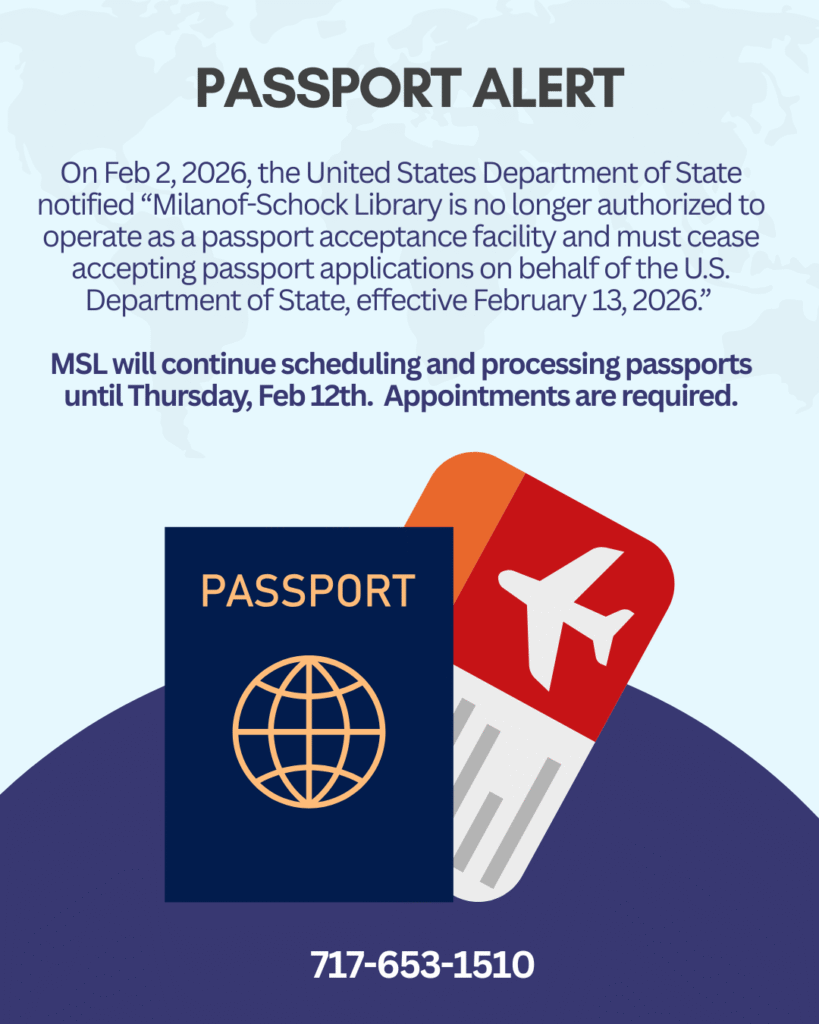 On Feb 2, 2026, the United States Department of State notified “Milanof-Schock Library is no longer authorized to operate as a passport acceptance facility and must cease accepting passport applications on behalf of the U.S. Department of State, effective February 13, 2026.”